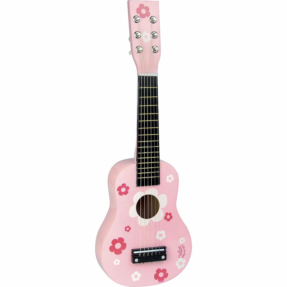 With this lovely wooden guitar decorated with flowers, little girls can discover music and develop their talent by creating new melodies. Guitar with 6 real nylon strings. Sold with plectrum and one spare string.