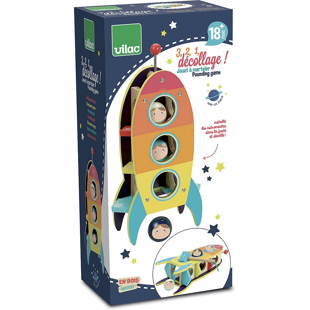 In The Stars whacking hammer toy by Vilac. Hammer each of the three astronauts into the rocket ready to take off! A wooden toy to hammer that promotes the motor skills of children. Beautifully designed by specialist French toymakers Vilac.