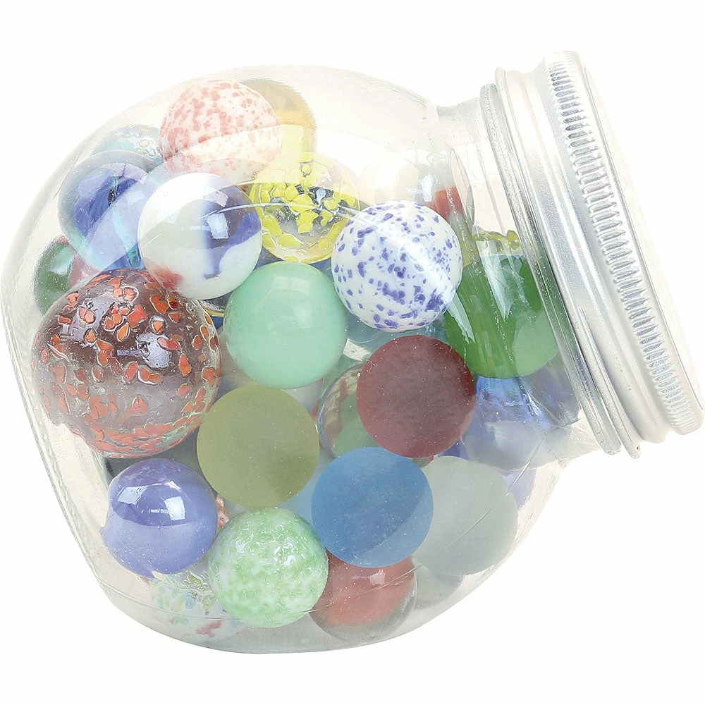 Jar of marbles by Vilac. Contains 50 assorted marbles, great for traditional play or to use as a rewards jar.