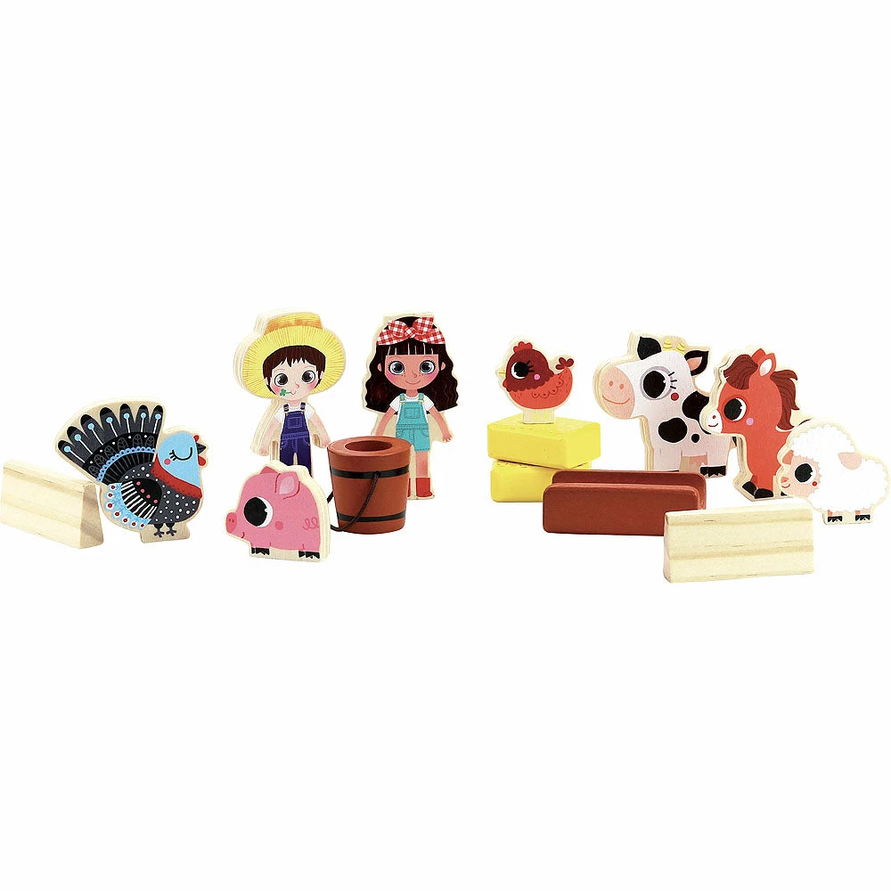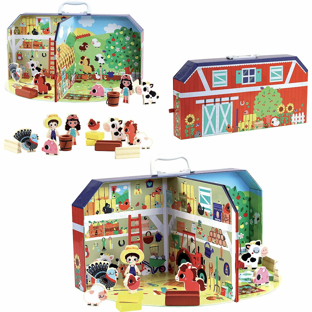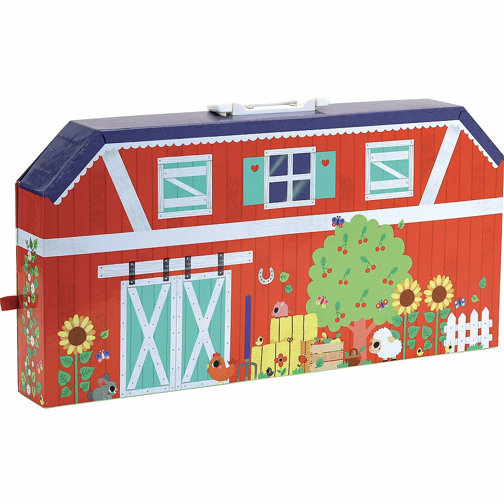 The box becomes the farm when folded open and contains 14 wooden pieces. The farm has a handle for easy transportation.