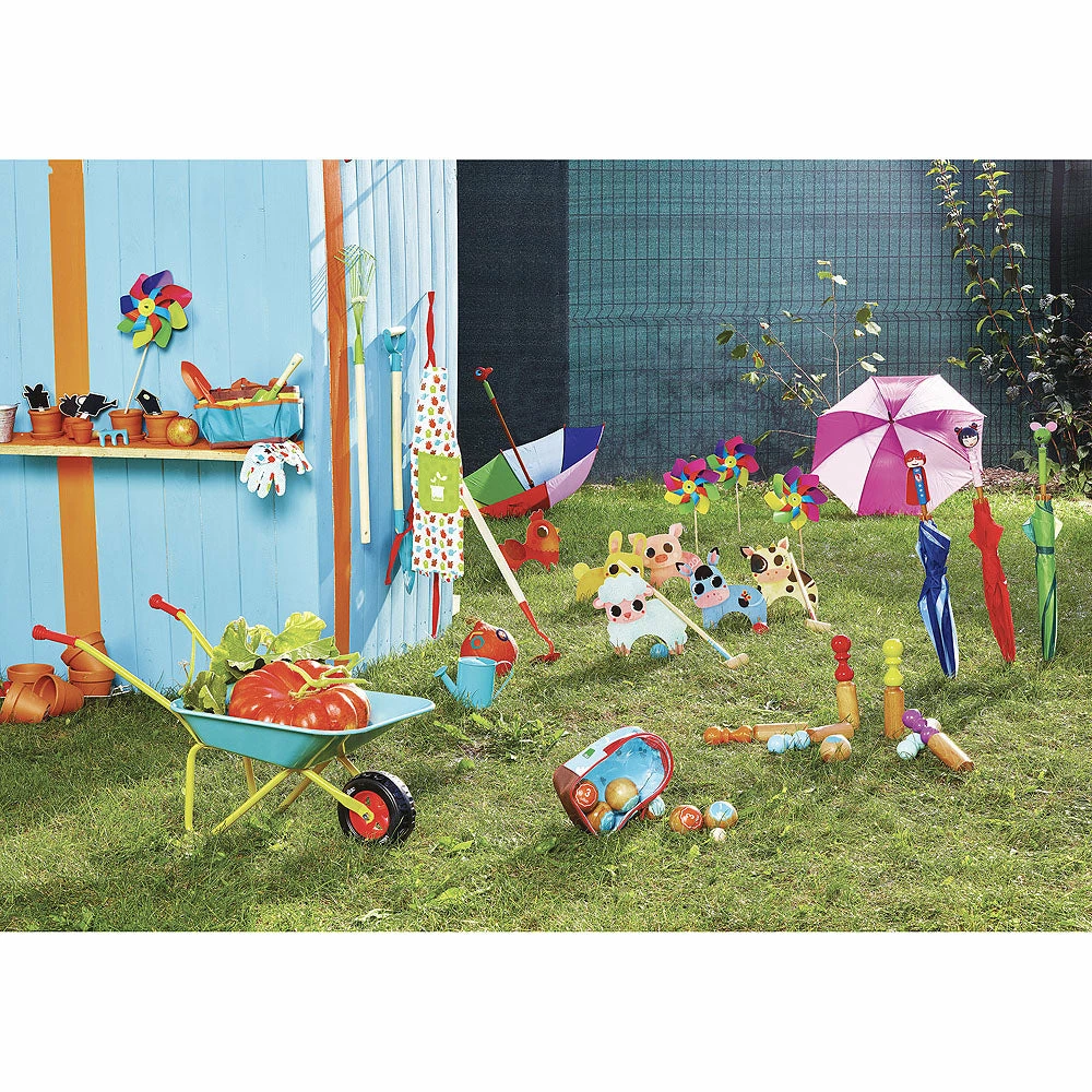 This Gardening Bag contains a watering can, a shovel, a rake and a spade. A beautiful set to play with in the garden!